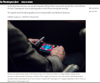 Senator John McCain was caught by a Washington Post photographer playing poker on his phone while his colleague John Kerry argued for a military strike against Syria yesterday. After the photo began circulating McCain took to Twitter, writing: “Scandal! Caught playing iPhone game at 3+ hour Senate hearing - worst of all I lost!”