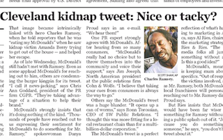 USA Today tries to decipher whether McDonalds’ tweet in the wake of the Ohio kidnapping story was tacky or nice. Charles Ramsey, the neighbor who helped free Amanda Berry from the house where she and two others were held cative for 10 years, told news camera after news camera how he heard Berry scream while sitting down on his porch to enjoy a Big Mac. McDonalds interpreted that as a PR opportunity, tweeting “We salute the courage of Ohio kidnap victims & respect their privacy. Way to go Charles Ramsey — we’ll be in touch.”