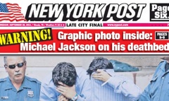 The front-page “warning” in the New York Post is more of an invitation than anything else: WARNING GRAPHIC PHOTO INSIDE. MICHAEL JACKSON ON HIS DEATHBED. Prosecutors showed a jury this photo as they opened their case against Dr. Conrad Murray: