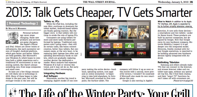 The Wall Street Journal’s Walt Mossberg writes tech predictions for 2013 in today’s paper. Some big trends to look out for: tablets will continue to chip away at the laptop’s appeal; TVs will get smarter (look for an Apple TV that seamlessly integrates the Internet); and smartphones—and their plans—will get cheaper.