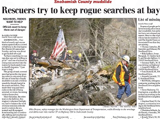 Rescuers searching for the more than 100 people missing from Saturday’s mudslide in Washington are having a tough time preventing volunteers from conducting their own searches for victims. The fear is that untrained volunteers could become victims themselves in the continually shifting slide.