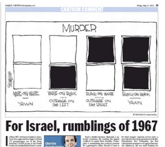 It’s murder, simplified. The New York Daily News reprints a Philadelphia Daily News editorial cartoon showing how the public reacts to various murders. “White on White=Yawn.” “White on Black=Outrage on the Left.” “Black on White=Outrage on the Right.”  “Black on Black=Yawn.”