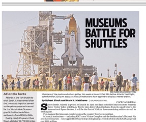 There’s a different kind of space race going on says the Orlando Sentinel, but this one is taking place on solid ground. As the shuttle Atlantis prepares for its final lift-off this afternoon, museums around the country are fighting for the opportunity to exhibit the storied space craft, or one of the two other orbiters NASA will retired later this year. The final decision might come down to which institution can afford the $28.8 million price tag NASA wants for displaying each shuttle. At least 21 institutions have submitted requests, including the Smithsonian’s National Air and Space Museum and New York’s Intrepid Sea, Air & Space Museum.