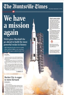 NASA officials revealed their plan to make “the most powerful rocket ever built” at a press conference yesterday. Huntsville, Alabama is home to the Marshall Space Flight Center, where the rocket will be built. And the front page of the Huntsville Times this morning was giddy about the prospect of jobs in the region. One problem: NASA has estimated the rocket will cost about $18 billon. They have not announced how they plan to pay for it.
