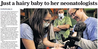 Neonatologists in San Francisco have been taking care of an unusual patient, a baby gorilla born at the San Francisco Zoo 10 weeks ago. The birth of the endangered western lowlands gorilla was a rarity - the San Francisco Chronicle says only about half a dozen are born in the U.S. each year. That’s why zookeepers brought in the team of human baby doctors. The zookeepers say while they’re very familiar with adult gorillas, the human baby doctors are much better equipped to deal with the newborn gorilla.