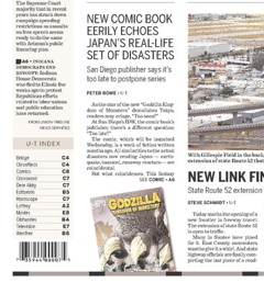 Talk about bad timing. A San Diego comic book publisher is worried that today’s release of “Godzilla Kingdom of Monsters” might make some people cringe. Not only does the story start with a “lethal threat erupting from the sea,” it involves an “earthquake, tsunami [and] runaway reactors” says the Union Tribune. Publisher IDW says the book went to print on February 15, before the real-life crisis in Japan occurred. They contemplated pulling the issue but decided to donate proceeds from a special batch with commemorative covers to aid the tsunami relief.