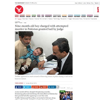This one is a bit of a head-scratcher. A nine-month-old boy in Pakistan was granted bail by a judge after appearing in court on attempted murder charges. The Independent says police arrested the boy along with 30 others for allegedly throwing stones at police during a raid on their house in Lahore. The judge noted the absurdity of the case in granting bail, but he did not have the power to dismiss the charges. The inspector behind the arrest has been suspended.