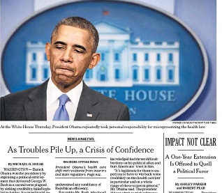 In the New York Times, Michael Shear says President Obama’s difficulties with the Affordable Care Act roll out have drawn comparisons to the Bush administration’s response to Hurricane Katrina. Shear says Obama is now dealing with some of the same problems that plagued President Bush’s second term. But some Democrats are warning against counting Obama out.