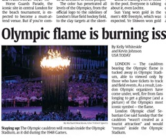 USA Today says the Olympic flame has become a “burning issue” for organizers of the London Games. The caldron is only visible from inside the Olympic stadium, which means those hoping to catch a glimpse (and snap a photo) of the iconic symbol are out of luck. Vancouver, by comparison, had two cauldrons, one of which was open to the public.