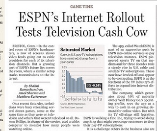 The Wall Street Journal examines ESPN’s efforts to expand into internet distribution. The cable sports network sees its WatchESPN app as a way to cash in on the growth of online video. But the network must be careful not to encourage cable customers to drop their subscriptions. For now, ESPN only allows pay-television customers to stream live games on the app.