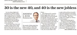 There’s a somewhat depressing headline on the front page of the San Francisco Chronicle this morning: “30 is the New 40,” it reads, and “40 is the New Unemployed.” Columnist Andrew S. Ross says job experience doesn’t matter like it used to in Silicon Valley, a place that is dominated by youth. The fact is that young people have simpler lives, says Mark Zuckerberg. “We may not own a car. We may not have family. Simplicity in life allows you to focus on what’s important.” Like working on an app for seven days straight. Ross says it’s this attitude that’s created a situation in the Bay Area where thousands of veteran tech workers are out of a job at the same time that the industry says it has a glut of positions to fill—so many that it must recruit workers from overseas.