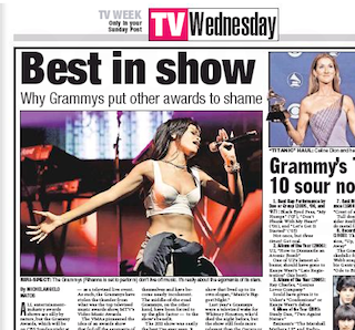 NY Post TV writer Michelangelo Mato says the Grammys are the most entertaining of all the awards shows, because pop music knows how to do three-minute spectacles like no one else. Matos says they have stolen the show from the VMAs, which “pioneered the idea of an awards show that fed off the egomania of its performers.” He says while the VMAs have become “incoherent” as artists try to top each other’s antics, “the middle-of-the-road Grammys…have been forced to up the glitz factor — to the show’s benefit.”