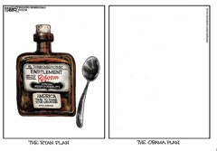 There’s a funny editorial cartoon in the New York Post this morning by way of Investors Business Daily. Paul Ryan’s plan is pictured as nasty medicine with the direction, “America, it’s time to take your medicine.” That’s President Obama’s economic plan pictured on the right. You can see it’s…blank.