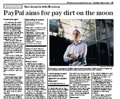 PayPal is looking towards the final frontier for its next business venture, says the San Francisco Chronicle. The online payment company is partnering with the SETI Institute to investigate a future where payments could be made in space. Serious questions will be addressed, like how people will pay for their space hotel once galatic tourism really takes off. Or how companies will deal with “time delays as an electronic payment confirmation signal travels 238,000 miles from the moon back to Earth?”
