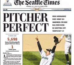The Seattle Times calls him “Perfect Pitch Felix.” The Mariners’ Felix Hernandez pitched a perfect game yesterday, his third this year. Yesterday’s game was only the 23rd perfect game in Major League Baseball history.