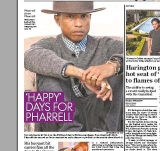 USA Today has a profile of Pharrell Williams. He’s coming off a huge year with his hits like Blurred Lines and Get Lucky. His song Happy from Despicable Me 2 is up for an Oscar. USA Today calls him the music industry’s “most impressive multi-hyphenate: rapper, singer, songwriter, producer, drummer, fashion designer, philanthropist. And hat enthusiast.” He says he’s happy to be part of a movement of music that is pushing feel-good themes.