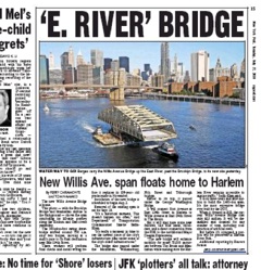 There was a spectacular Associated Press photo picked up in several of the papers this morning. It’s of a replacement for the Willis Avenue Bridge being moved to its new home. The New York Post says the 300-plus foot structure passed under both the Manhattan and the Brooklyn Bridges as it made its way (slowly) uptown on the East River.