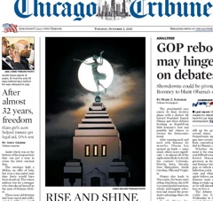 Beautiful photo on the front page of the Chicago Tribune this morning. That’s a harvest moon—a full moon that falls closest to the autumn equinox—beaming behind a statue atop the old Montgomery Ward building. Tribune photographer Chris Walker details how he got the amazing shot on the paper’s blog.