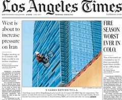 Crazy photo on the front page of the LA Times this morning. That’s Chad Kagy practicing for the BMX Big Air competition, which is part of the X Games. Los Angeles is hosting the games, which begin today and run through Sunday.