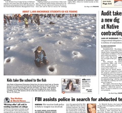 Readin’, writin’, ice fishin’? Great photo on the front page of the Anchorage Daily News this morning. The Alaska Department of Fish and Game taught about 1400 elementary school kids how to ice fish. I hope they don’t have to catch their lunch.