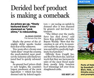 As beef prices rise, fine textured beef or “pink slime” as critics call it, is making a comeback. The Kansas City Star says the furor over the meat product has died down. The country’s largest producers are seeing an uptick in demand. Federal regulators declared the beef product to be safe. One company still has a pending lawsuit against ABC News over its use of the term “pink slime.”