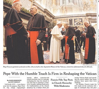 The New York Times says Pope Francis has reshaped the Vatican in the first year of his papacy, taking on the bureaucracy that some believe led to the historic resignation of his predecessor. Despite his humble touch, Francis has made bold moves to change up the power structure of the Vatican. The Times says in some respects, he’s just bringing in his own team. But he’s also looking to change the culture of church leadership and is “upending the career ladder that many prelates have spent their lives climbing.”