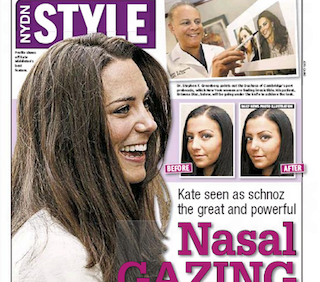 I’m not sure whose sniffer she’s replaced, but according to the New York Daily News, Princess Kate’s nose is the current nose of choice for plastic surgery customers. One surgeon told the News that so many requests have been made for “London’s prettiest royal bridge” that his office now keeps dozens of photos of Kate on file for consultations; another says he has 20 women scheduled to get a $7,000 Kate nose next month alone.
