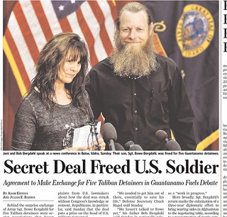 The release of Sergeant Bowe Bergdahl by the Taliban in a swap for five Guantanamo prisoners is the subject of a front page story and an editorial in the Wall Street Journal. The Journal weighs in on the propriety of such deals - saying this isn’t the same as prisoner swaps in previous battles that have come along with a peace deal. The Journal says in this case, “the Taliban can continue the war with their ranks enhanced.”