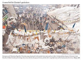 Protesters in Ukraine appear to be in it for the long haul. The Washington Post has this photo of a snow fort they’ve built to protect their encampment. Protesters want Ukrainian President Viktor Yanukovych to sign a trade agreement with the European Union, which he has agreed to do. But it might not happen until the spring, meaning a long winter for the protesters.