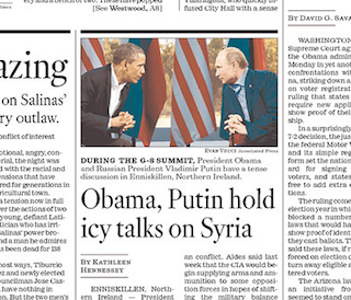 Several photos of President Obama and Russian President Vladimir Putin at the G8 make the papers this morning, and none of them are that flattering. In fact, in most of them the two leaders look like they’d rather be anywhere else in the world. The LA Times says the mood was tense in Northern Ireland as the conversation turned to the civil war in Syria. SEE PHOTOS