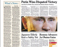 Prime Minister Vladimir Putin’s “disputed victory” is on the front page of the Wall Street Journal this morning. Putin won yesterday’s presidential elections despite the “biggest anti-Kremlin protests in two decades.” The Journal has a photo of Putin looking teary-eyed, even though he’s known for being a manly man. He later made it clear to reporters that he wasn’t crying. He said the tear was caused by a chilly wind.