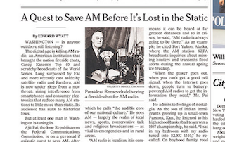 There’s an interesting article about AM radio on the front page of the New York Times this morning. Though listenership is at an all-time low thanks to competition from FM, Internet and satellite radio stations as well as increased interference with smartphones, one man is pushing the FCC to overhaul AM radio. His message? That its longer wavelength can be heard over greater distances, making it crucial in emergency situations.