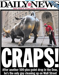 The front page of the New York Daily News this morning is classic. Photographer Marcus Santos got a picture of a guy sweeping the street next to the Wall Street bull sculpture. The adjecent caption says: “After another 500-plus-point in the Dow, he’s the only the cleaning up on Wall Street.”