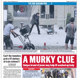 The mercury reached 80 degrees yesterday in New York but there was snow on the ground in Manhattan. No, it’s not the end of the world. The Daily News says it was just a commercial shoot. I feel for the actor bundled up in a scarf and gloves—hopefully he had an air-conditioned trailer waiting for him.
