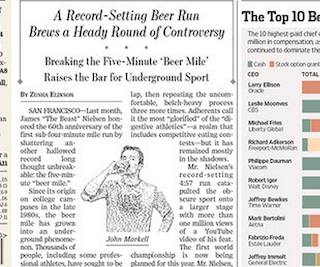 Last month, James “The Beast” Nielsen ran a sub 5:00 “beer mile” breaking the record for the underground phenomenon where competitors chug a beer before each lap of a one-mile run. His 4:57 run has been viewed on YouTube more than a million times. But the Wall Street Journal says critics are questioning whether he had any unfair advantages. The matter should be settled during the first-ever Beer Mile World Championships this year.