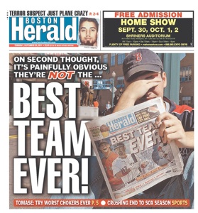 “Boston Tear Party.” “Sox Make Unwanted History.” The headlines out of Boston this morning are glum. The Red Sox capped a massive September collapse with a 4-3, ninth-inning loss to the Orioles last night, which prompted the Boston Herald to opine, “on second thought, it’s painfully obvious they’re NOT the best team ever.”
