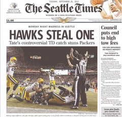 The Seattle Times writes that their opponents “left town steaming, [while] the rest of the country was debating the validity of that final call on Tate’s touchdown and Seattle was pinching itself.”