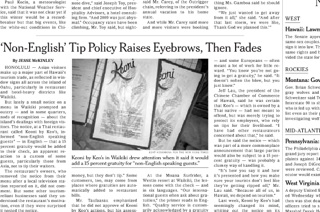 How’s this for a double standard: The New York Times writes about a restaurant in Hawaii that requires a mandatory 15 percent tip from non-English speakers. Native English speakers, on the other hand, get to set their own tip. According to the Times, it’s “a custom of some guests, particularly those from Asia, not to tip their waiters.” Asians make up the majority of Hawaii’s tourists. The owners of the Thai restaurant who imposed the non-English gratuity (which they explained, in English, on their menu) removed it after receiving media attention but many locals say they understand the motivation: “It’s not part of their culture. They spend a lot of money, but they don’t tip.”