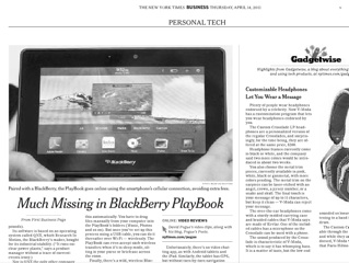 Mossberg is equally puzzled by the decision. He writes, “this odd system, aimed at pleasing security-concerned corporate customers, doesn’t work with other smartphones. So, in my view, even though Bridge is a neat technical feat, it makes the PlayBook a companion to a BlackBerry phone rather than a fully independent device.” R.I.M. has said it will rectify the issue by this summer.