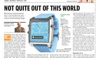 USA Today’s Ed Baig reviews a smartwatch created with Kickstarter funding in this morning’s paper. Called the Martian Watch G2G, it claims to be the first voice-controlled model on the market. Basically it serves as a proxy for your smartphone, letting you call and text with your phone still in your pocket. But Baig says even though that’s cool, it’s “a pricey product with limited mainstream appeal, and one with some features that were either too complicated or didn’t work at all.”