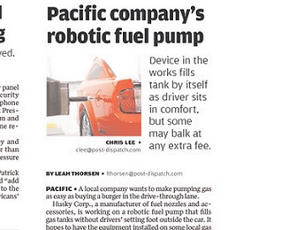 The St. Louis Post-Dispatch says a local company is working on a robotic fuel pump that would allow you to fill your gas tank from the comfort of your car. You could pay and select your grade of gas either by touchscreen or through a smartphone app. The developers hope to have it up and running in 6 to 9 months, though it remains to be seen whether drivers would be willing to pay a little extra for the convenience.