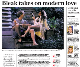 Love is definitely not in the air on the air. The San Francisco Chronicle’s David Wiegand says three shows debuting Thursday sum up perfectly the way romance is depicted on television these days. Married, Satisfaction and You’re the Worst all offer “exceptionally bleak views of modern relationships and marriage.” Wiegand says while the shows are all actually pretty good, they reflect the cynicism of the times, not just about romance.