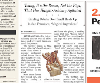 Resident’s of San Francisco’s Haight-Asbury neighborhood are up in arms, says the Wall Street Journal. The peace-loving residents recently worked to shut down a restaurant called Bacon Bacon because “the scent of bacon grease was blowin’ in the wind.” Now bacon fans are lining up—some 3000 turned out last week—to protest what they see as an unfair smear against their favorite meat. For the record, flavor scientists say while cooked bacon sends off that delicious smell most people know and love, the by-products can smell like paint of wet cardboard.