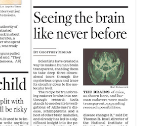 Scientists at Standford have come up with a way to make the human brain transparent, says the LA Times. Described as “transformative” and “cool” in the journal Nature, the technology lets researchers take 3-D tours of the brain and see areas that were hidden before. Experts say the innovation could lead to rapid changes in the way brain diseases like autism and Alzheimer’s are treated.