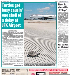 I got an email from Jeremy Olshan, who wrote the New York Post‘s version of the story. He pointed out that the turtles were not sex-starved—they were sex-sated. In fact, they were crossing the runway to looking for a place to lay their eggs.