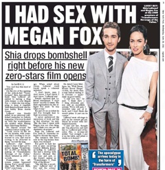 Nothing like dropping a red herring days before your critically-panned movie debuts. That’s exactly what Shia LaBeouf did, says the New York Post, when he disclosed in a recent interview that he’d had sex with Megan Fox when they were co-stars on the Transformers set. LaBeouf kiss and told during a sit down with Details Magazine. When asked whether Fox was dating current husband Brian Austin Green when the alleged tryst took place, LaBeouf apparently answered with 12 I don’t knows.