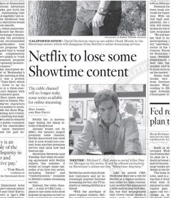 There’s bad news for Netflix subscribers in today’s LA Times. Showtime just announced that it will not provide episodes of its series—including hits like “Dexter” and “Californication”—for the site’s streaming service when their existing contract runs out this summer. Experts say it’s a sign that the “TV industry is viewing Netflix as a threat.”