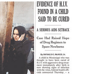 Disappointing news from Mississippi as health officials announce a child who was thought to have been cured of H.I.V. through the use of an aggressive treatment regimen is now showing signs of infection. The girl’s apparent cure had raised hopes of being able to reverse infections in newborns and perhaps even adults. The New York Times says this development will likely affect plans for a clinical trial involving as many as 450 babies.
