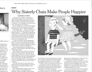 If you’ve been feeling down recently, get a sister. There’s a really interesting article in today’s New York Times about sisterly chats. According to several studies on the topic, having a sister makes you happier. One hypothesis is that women are more inclined to open up and share their emotions, which leads to closer bonds.