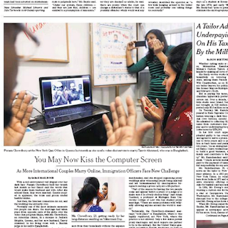 You may now kiss the computer. The New York Times chronicles the rise of the Skype wedding in today’s paper. Officially it’s known as a proxy wedding when one spouse is in a remote location, and the Times says they’ve been going on for centuries (Marie Antoinette and Louis XVI had one.) But the trend is sending US immigration officials into a tizzy, even though few states allow proxy marriages and most require one person to be a member of the military.